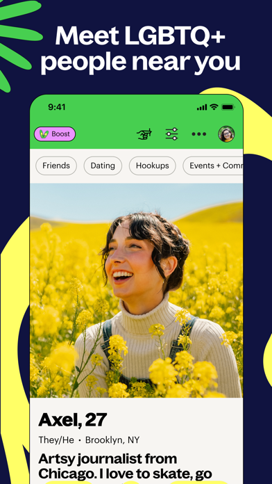 Read and write posts to find local queer community - introduce yourself, ask questions, tell stories, vent, find friends near you. Scroll the feed, use our discover friends tab or group explore page to find lesbian, trans, bisexual and gay people near you.