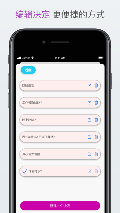 你可以把你的可选的答案都添加到软件当中,让机器帮你做决定,解放了自己纠结的内心。更多的选择等待你去探索哦~