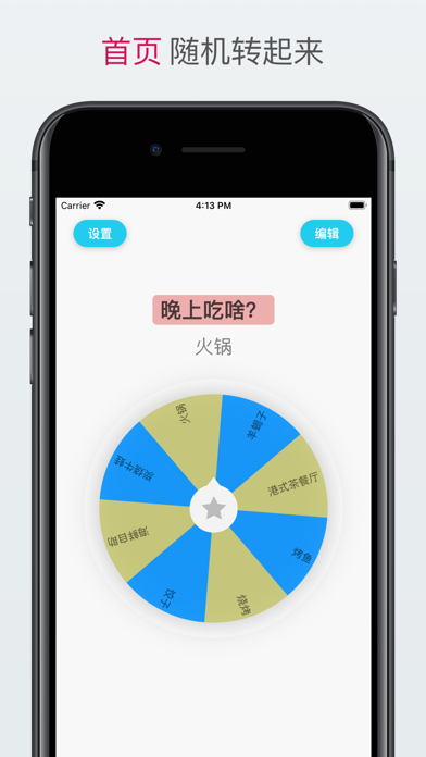 软件基础功能就是通过转盘的方式帮你随机选择你预先列好的选项。和其他的类似软件不同,你可以定制转盘的背景,从相册里选择图片来作为转盘的背景。整体来说比较简洁,后续功能慢慢完善。