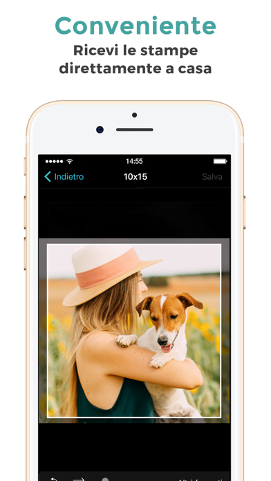 Con pochi semplici tocchi, dall'app potrai accedere agli album fotografici, al Rullino foto o allo streaming foto del tuo iPhone, nonché alle foto digitali pubblicate su Facebook, Dropbox, Google Photos e Microsoft OneDrive. Seleziona le foto che desideri ricevere come stampe da 10x15, ritagliale in base alle tue esigenze e completa l'ordine.